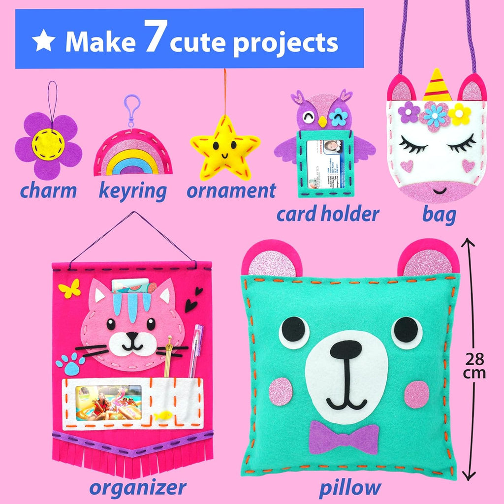 - π¦ Make 7 Easy Projects π¦ : Make a total of 7 beginner Sewing Art & Craft kit with Bag, Ornament, Pillow, Mini Card Holder, Organizer & Mini Rainbow. Tools and precise visual step-by-step instructions for stress-free learning also included for plush craft.