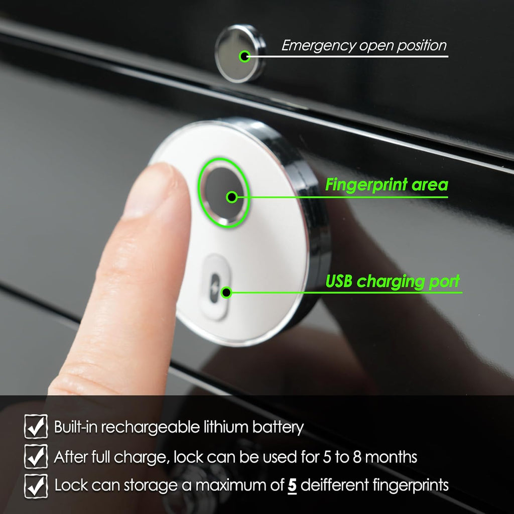 • FINGERPRINT LOCK: Highly sensitive biometric fingerprint recognition technology, it can be opened with a touch of a finger, which is at the same level as a door lock. It can store 5 fingerprints, can be used for 5-8 months after fully charged, and has an emergency unlocking design, so there is no need to worry about the lock stopping working. The fingerprint lock has a service life of more than 100,000 presses.