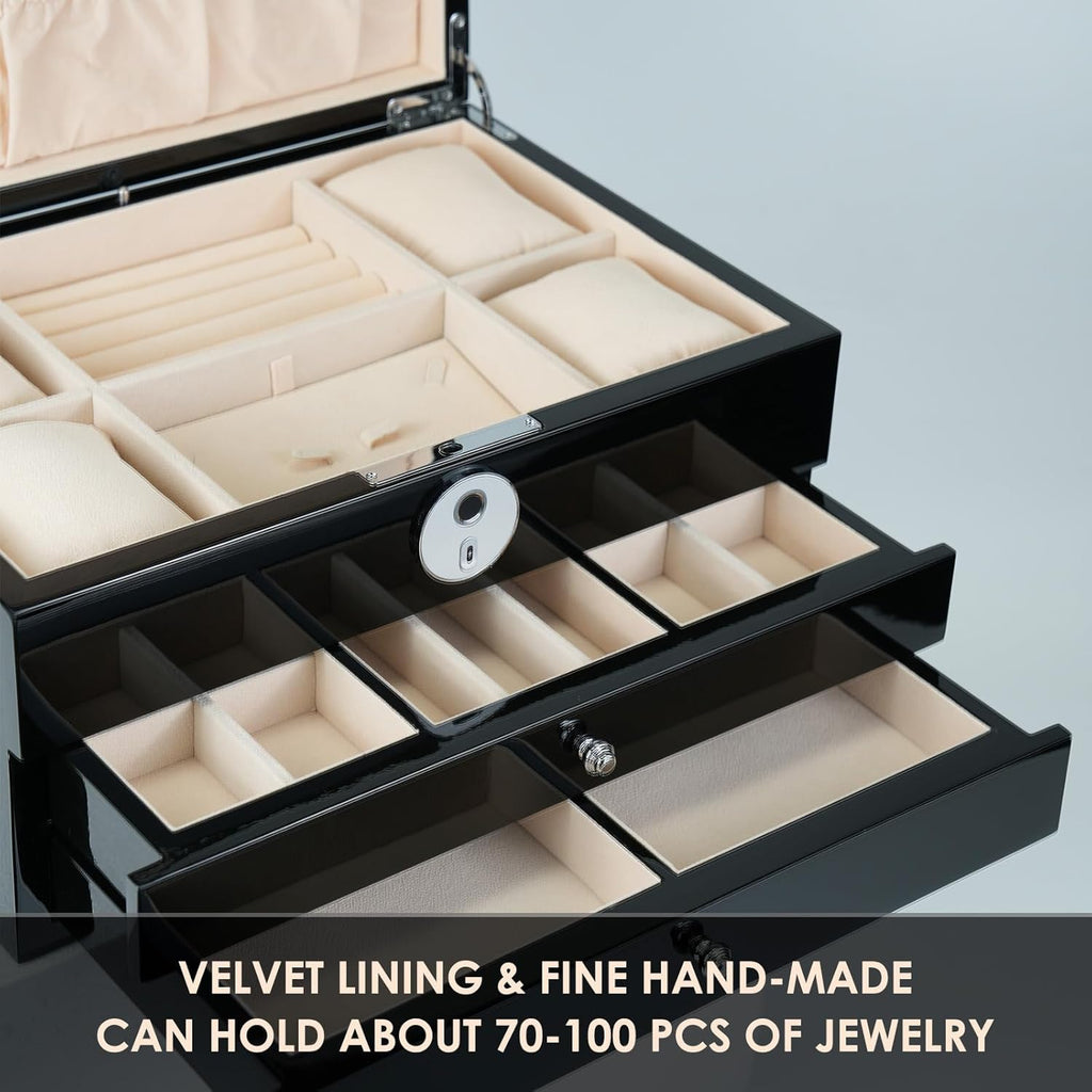 Jewelry Box with Fingerprint Lock, Black Wood Piano Lacquer Jewellery Organizer Storage Box with Drawer, 3-Layer Full Lockable, for Women or Men'S Gift