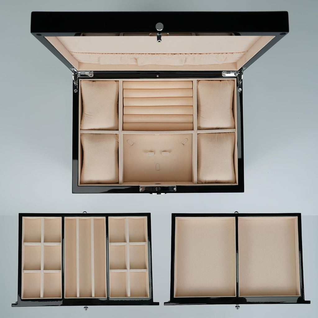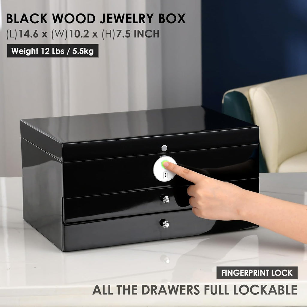 • HIGHLIGHTS: Fingerprint Unlock, 3-Layers full lockable, Black wood with piano finish, Large capacity, Suitable for all jewelry and watches.