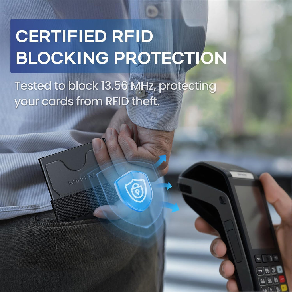 - Military-Grade RFID/NFC Protection: Built with solid aluminum shielding, this smart wallet blocks 13.56MHz signals to prevent digital theft. Safeguard credit cards and IDs from skimming devices – your data stays secure