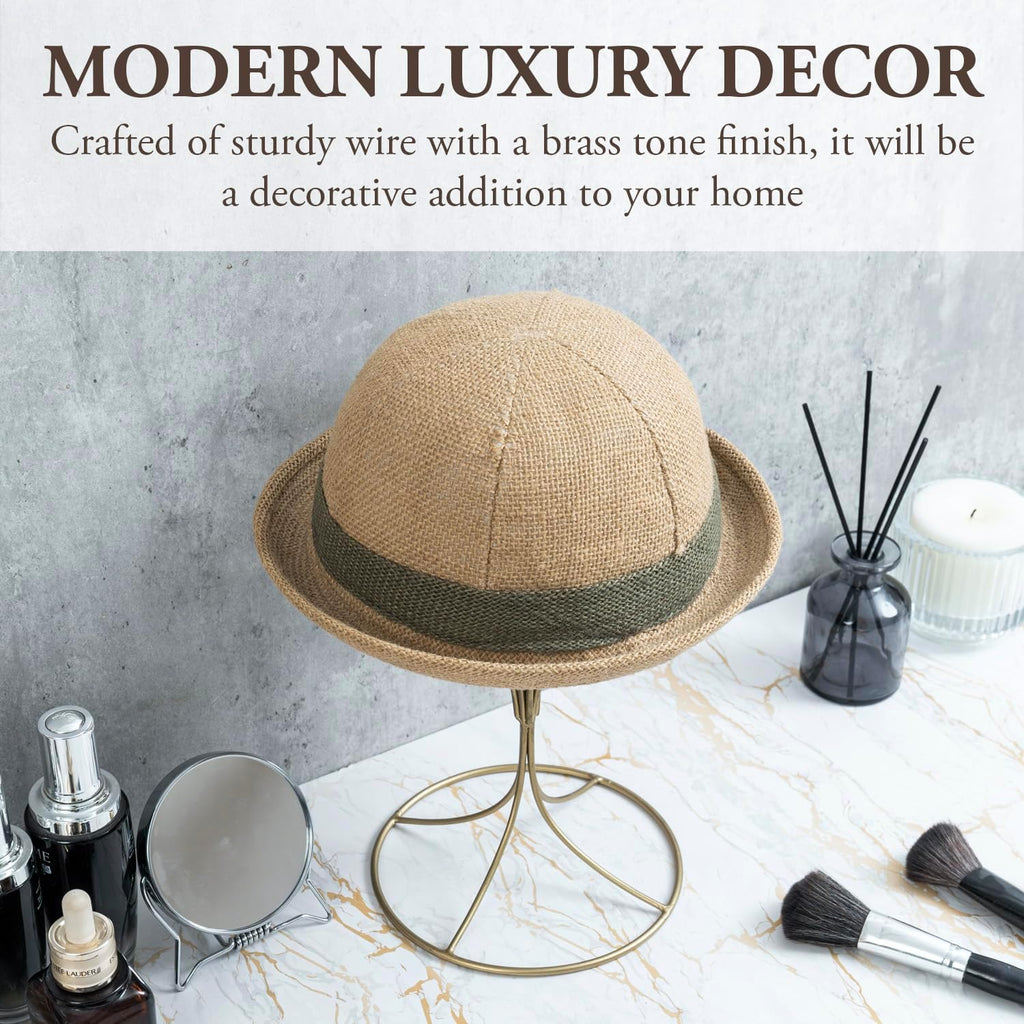 - The brass-tone metal finish brings a touch of modern and fashion flair to the decor to create an attractive display for your favorite hats or wigs. This modern hat stands is suitable for many home decoration styles, and will be a perfect choice to impress your guests or friends.