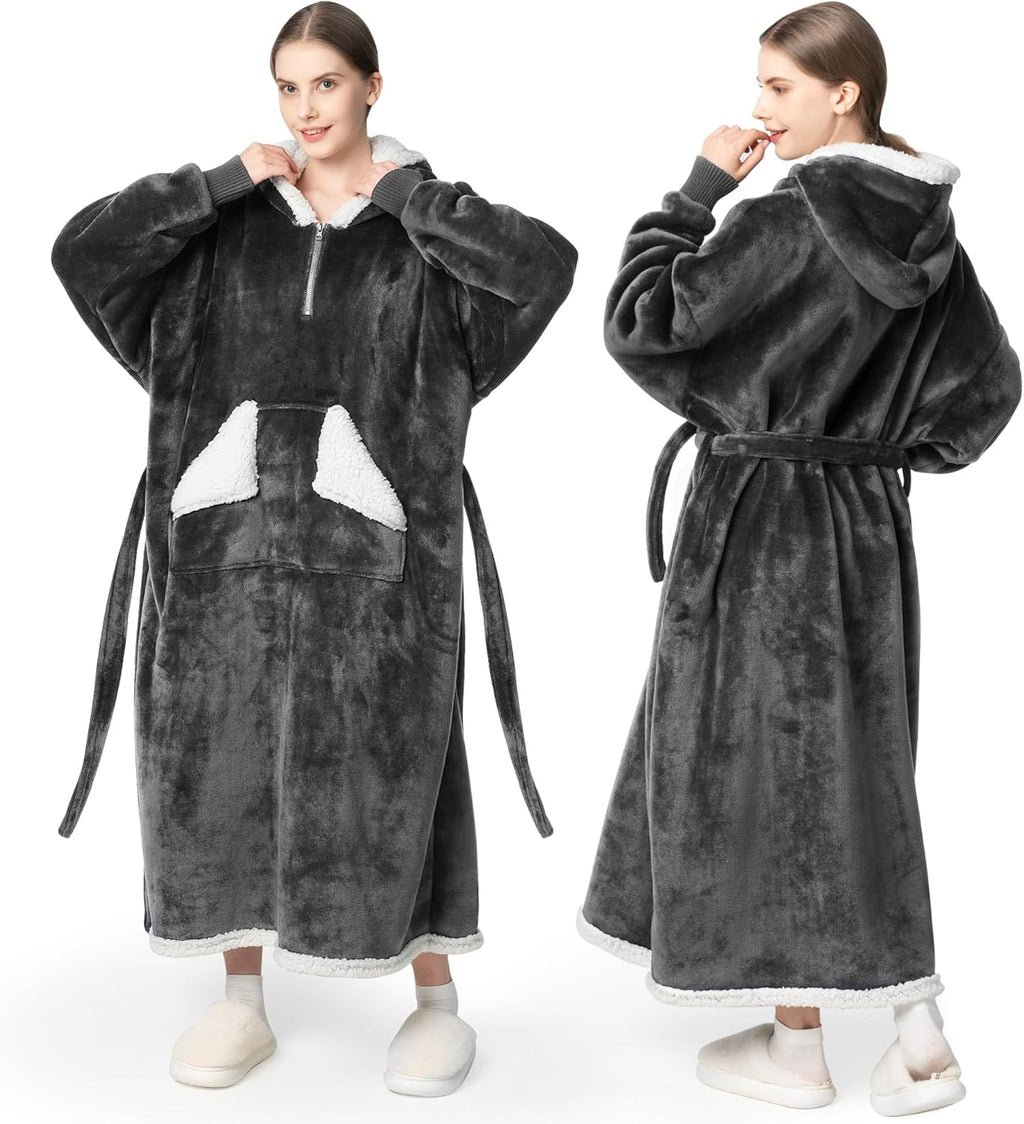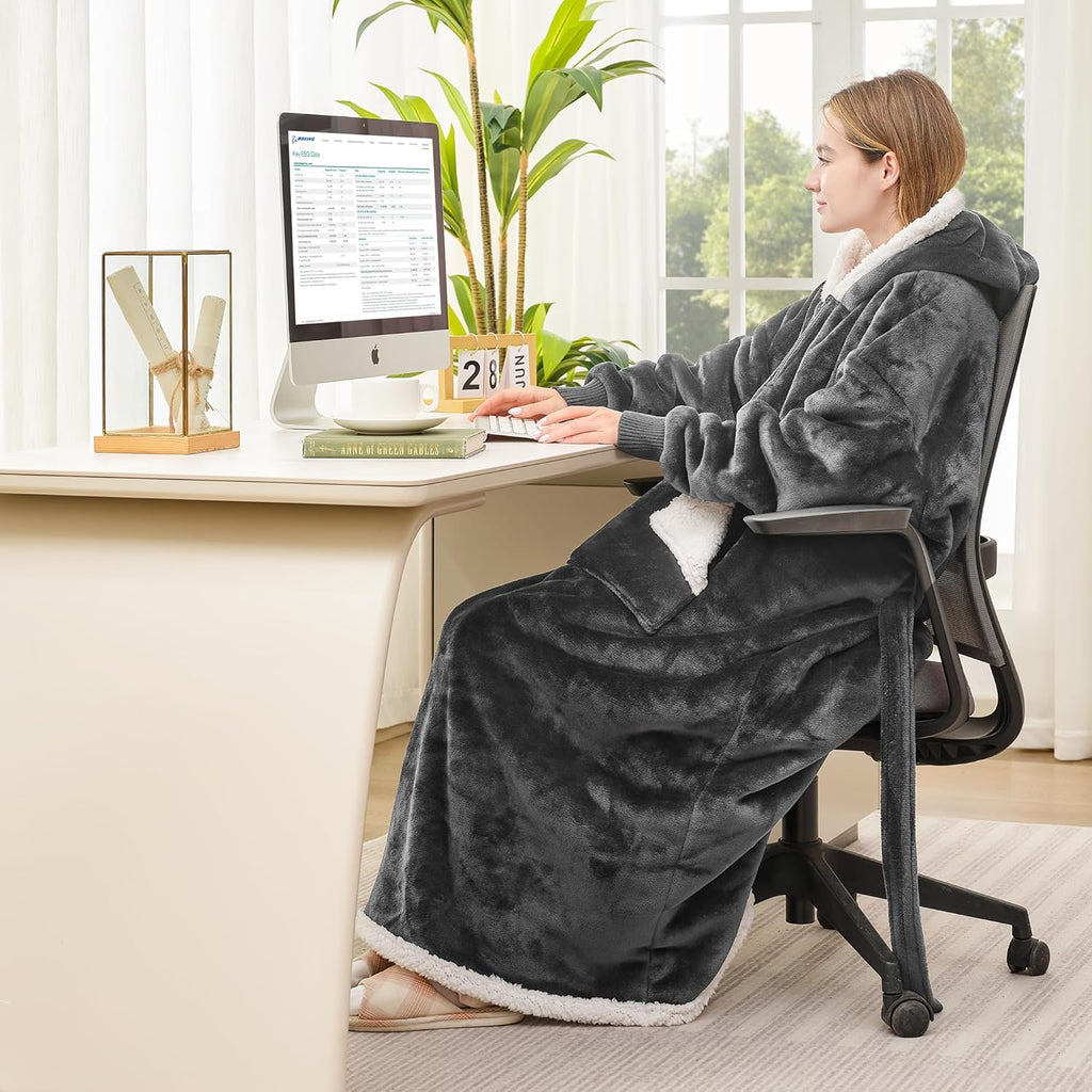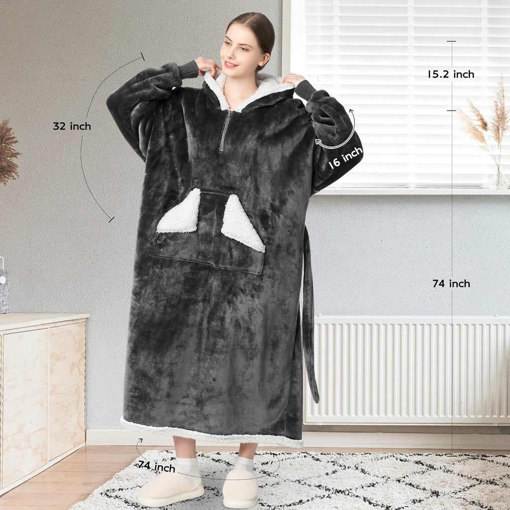 - 【LONG WOMEN BLANKET HOODIE】: Say goodbye to cold ankles and chilly legs. Our wearable blanket made with sherpa fleece and flanne is thoughtfully designed with an extended, ankle-length cut that offers complete coverage from top to ankle. No more chilly legs or cold ankle—just full-body warmth you can count on. Whether you're curled up on the couch, reading in bed, or sipping cocoa by the window, this extra-long hoodie blanket wraps you in head-to-toe comfort all winter long.
